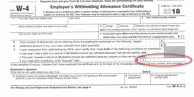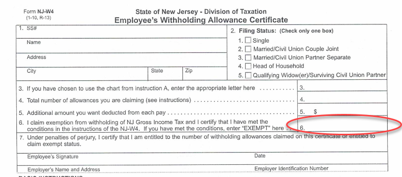 For New Jersey residents, if your total income will be less than $10,000 (including interest, dividends, capital gains, etc. in addition to wages) you should complete a form NJ – W4. Complete box 1 and 2 and then skip to box 6 and write the word EXEMPT. Sign and date and give to the employer. Once again income tax will not be withheld but other New Jersey payroll taxes (Unemployment, Disability and Family Leave) will be withheld.